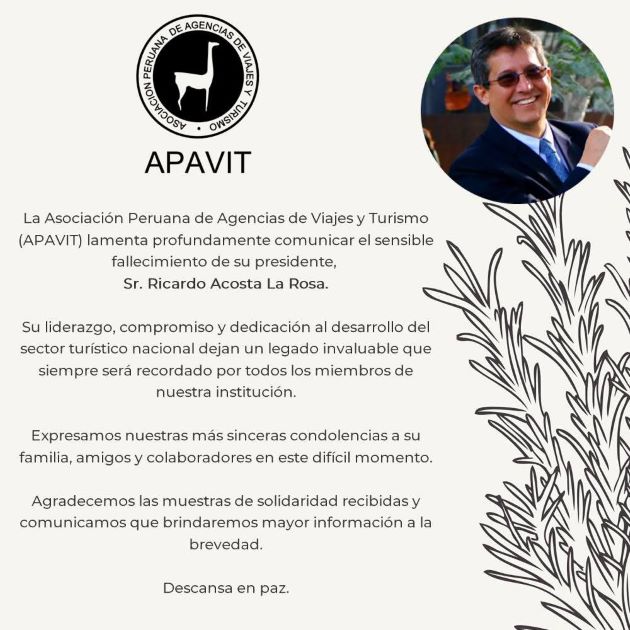 LIMA/PERU/05/10/2025.-La Asociación Peruana de Viajes y Turismo -APAVIT. Lamenta profundamente comunicar el sensible fallecimiento de su presidente el Sr. Ricardo Acosta La Rosa. Su liderazgo, compromiso y dedicación al sector turístico nacional dejan un legado invaluable, que siempre será recordado por todos los socios de nuestra institución.