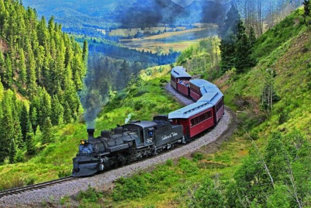 La ruta del tren serpentea a través de Colorado y Nuevo México a través de las montañas de San Juan. En el sitio web oficial del viaje en tren, la experiencia promete «zigzaguear” por las paredes de las Montañas Rocosas, atravesar dos túneles, y cruzar Cascada Caballete de 42 metros.
