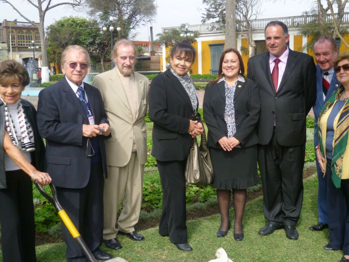 Histórica foto de la primera Siembra del Árbol del Integración Turística Latinoamericana, que causó una gran emoción entre los asistentes a la 2ª Asamblea, en la foto de Izq. a Der. María Shaw, un socio de Prensatur Perú, Roque Baudean en ese momento Presidente del Fórum, la Sra. Alcaldesa de Barranco Lic. Jessica Vargas, Mag. Elenita Villar Presidente de Prensatur en ese tiempo, nuestros queridos amigos Francisco Leal, representando a Chile, y Wilson Batista Sierra†. Realmente una ceremonia inolvidable